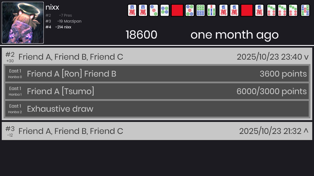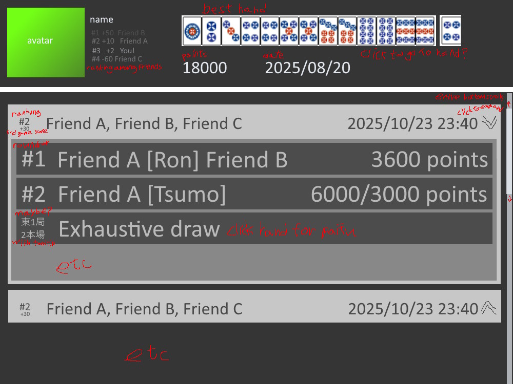 Getting the friend leaderboard and best hand was really easy, but I was going to have to do extra work for the tiles to appear. When I started recording data, I had only included the Paifu.md, so I would need to parse the entire thing to get the actual tiles of the finished hand. I decided to include a "handInfo" parameter in future data so I could bypass this extra processing, once I was done working on this.